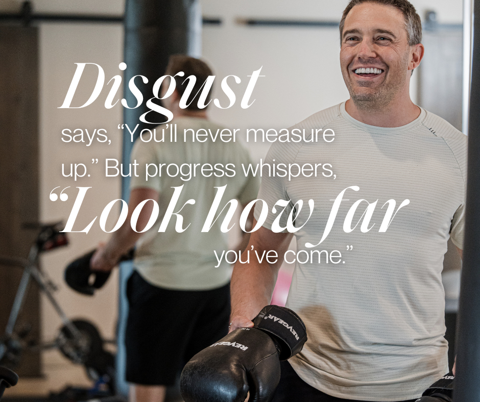 Because if we are relating to a fantasy perception, then we're never going to become, you know, we're never going to be able to move out of disgust, because we've literally decided we're going to live up to something that actually is impossible to attain. And if you're relating to something that's actually impossible to attain, man, is that a great way to get caught in and stuck in disgust potentially for the rest of our life? Right? And so instead of that, we want to look at these ideas of outcomes we want to achieve and make sure they're real and make sure they're healthy and make sure that they're possible. Is it real? Is it healthy? Is it possible? Will it actually give me what I'm looking for? Then if we're going to compare, instead of focusing on the imperfections, focus on progress. Focus on the ways in which you relate to that idea of yourself, that outcome you want to achieve, or acknowledge the progress you're making toward that outcome, or what are the actions you're going to take from here to achieve that outcome and to realize it and to fulfill it.